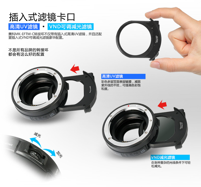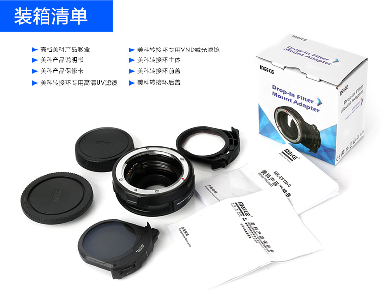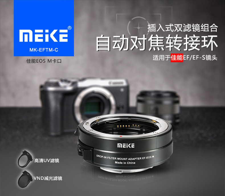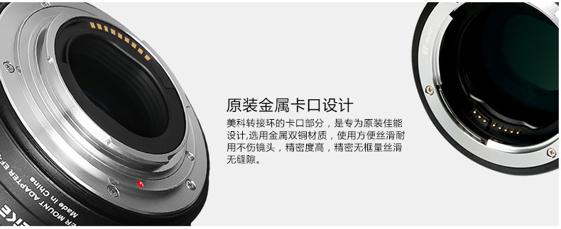 ◆ 用于佳能EOS-M系列數碼微單相機和佳能EF/EF-S鏡頭聯(lián)接時(shí)使用。對于不同的拍攝場(chǎng)景可支持插入式VND,高清Clear濾鏡支架,空支架。相機端與鏡頭端卡口均采用了金屬材質(zhì),提高了使用可靠性。專(zhuān)用密封圈具有防塵和防水效果,采用全電子卡口。